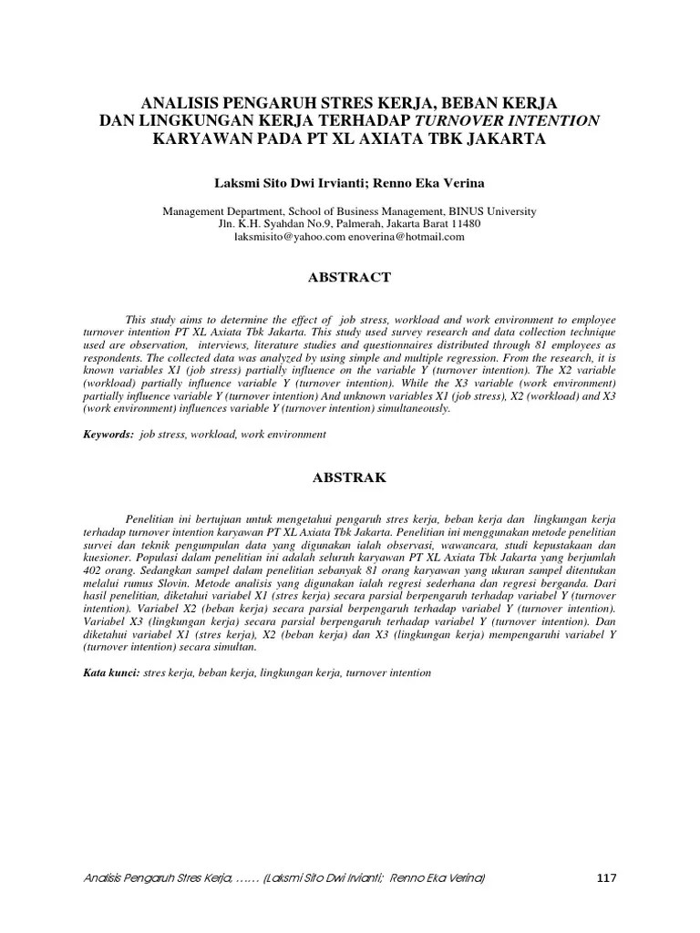 Penulisan skripsi mengenai "pengaruh stres kerja dan kepuasan kerja terhadap. Telekomunikasi indonesia tbk dengan penyebaran kuesioner. Indikator stres kerja antara lain yaitu konflik peran beban kerja pengembangan karir hubungan dalam pekerjaan . Peran ganda terhadap kinerja wanita karir dengan stres kerja sebagai variabel. Pengumpulan data primer dengan metode kuesioner.